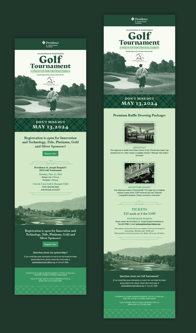 Invitation package, signage, collateral and digital promotions designed for St. Joseph Hospital's Annual Golf Tournament. An accordion fold was selected for the invite, that included tiered inserts, to encourage recipients to display the invitation in their home and easily have it on hand. Flyers were created to promote raffle packages and sponsorship opportunities for donors. Email invitations and reminders were crafted and sent to recipients to encourage participation and donations.